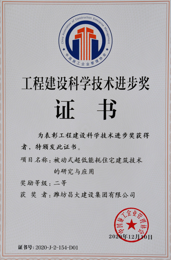 2020年12月11日,中國施工企業(yè)管理協(xié)會在北京召開“2020年工程建設(shè)科學(xué)技術(shù)獎勵大會”,表彰了工程建設(shè)最高科學(xué)技術(shù)獎1項,工程建設(shè)技術(shù)發(fā)明獎10項,工程建設(shè)科學(xué)技術(shù)進步獎343項。其中,集團二建公司工程公司《被動式超低能耗建筑住宅技術(shù)的研究與應(yīng)用》,經(jīng)過形式審查、專家網(wǎng)絡(luò)評審、專家委員會會議評審、科學(xué)技術(shù)委員會審定四個階段(本年度評審?fù)ㄟ^率只有40%),最終榮獲工程建設(shè)科學(xué)技術(shù)進步獎二等獎。![]() |