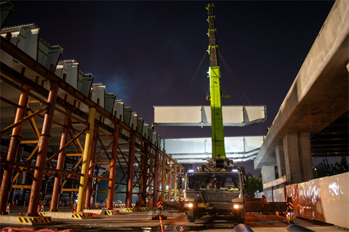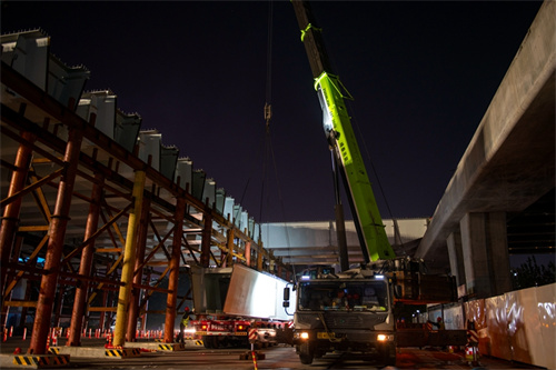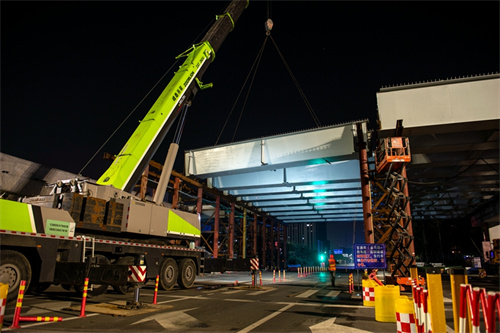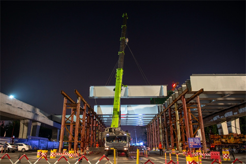 奮戰(zhàn)兩個(gè)晚上完成路口鋼箱梁吊裝為市民提供最大便捷——集團(tuán)寶通街快速路東方路、金馬路路口鋼箱梁吊裝完成