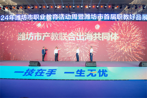 2024年5月17日上午,濰坊市產(chǎn)教聯(lián)合出海共同體成立揭牌儀式在富華國際展覽中心舉行,濰坊市副市長、市工商聯(lián)主席陳端梅出席。集團公司董事長徐鵬強出席儀式并與濰坊市教育局黨組書記、局長杜全平,山東科技職業(yè)學(xué)院黨委書記鄭德前,山東畜牧獸醫(yī)職業(yè)學(xué)院黨委書記鄭立森為共同體成立揭牌。